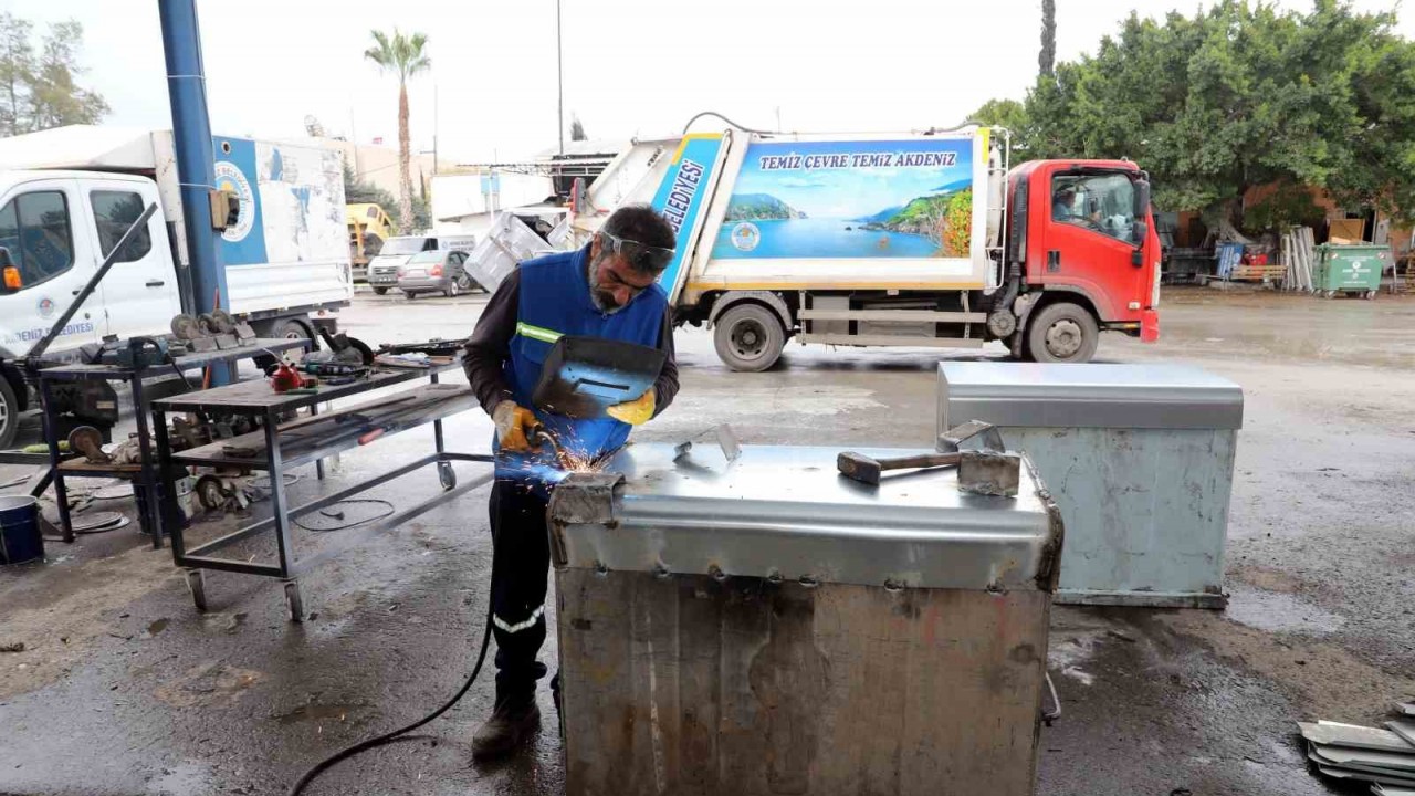Akdeniz Belediyesi hem üreterek hem de yenileyerek tasarruf sağlıyor. Fen İşleri Müdürlüğüne bağlı ekipler, belediye envanterinde bulunan hizmet araç ve gereçlerini tamir ederken, zaman içinde yıpranıp zarar gören çöp konteynerleri de makine ikmal sahasında yenileniyor.