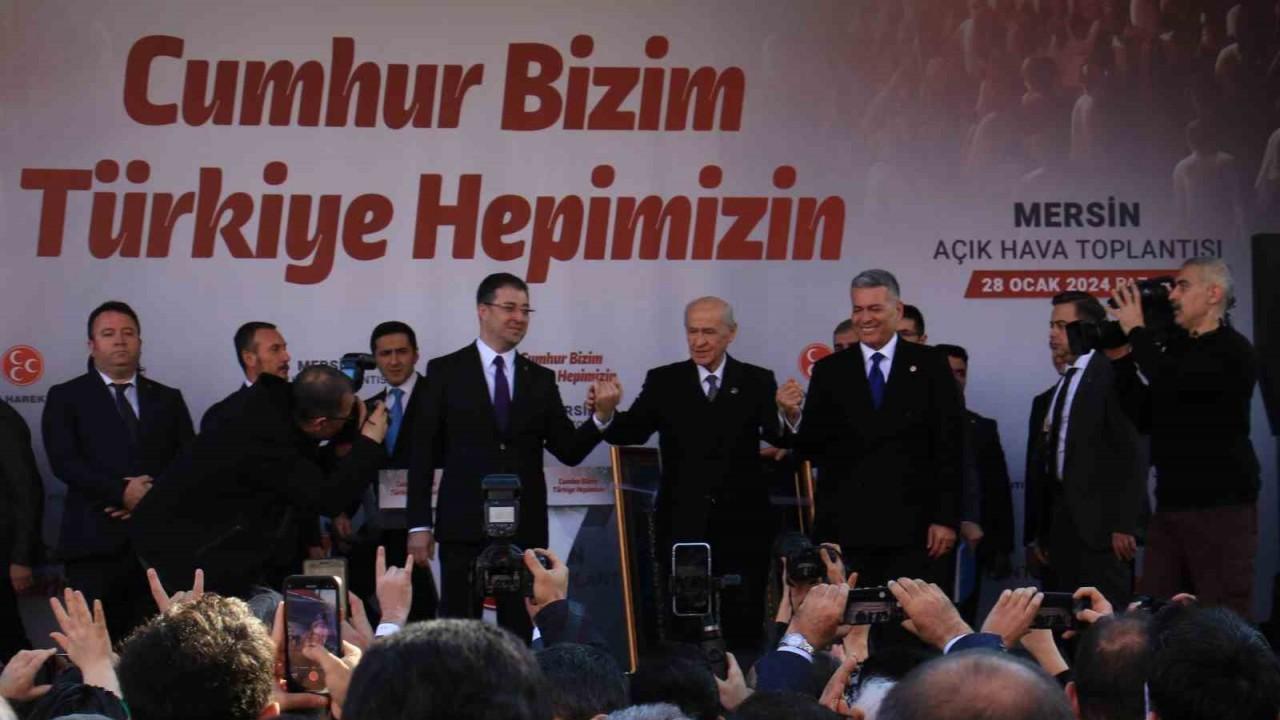 Bahçeli, mart ayındaki yerel seçimler öncesi ilk mitingini, ’Cumhur bizim Türkiye hepimizin’ temasıyla Mersin Millet Bahçesi yanındaki alanda yaptı. Konuşmasının başında Mersin’in her şeyden önce tarih, kültür ve ticaret kendi olduğunu vurgulayan Bahçeli, "Aynı zamanda Mersin kardeşliğin timsalidir. Burada ayrımcılığa yer yoktur, burada aymazlığa geçit yoktur. Mersin’de, Türkiye’mizin her yöresinin kokusu hakimdir. Ne var ki Mersin son 5 yıldır yerinde saymaktadır. Slogan milliyetçiliği, dedikodu belediyeciliği, sosyal medya belediyeciliği, ideolojik ve ilkel belediyecilik anlayışı Mersin’i yorgun düşürmüştür. Kayırmacılık, haksızlık, yolsuzluk ve hukuksuzluk Mersin’in önünü kapatmıştır. Kurulan paravan şirketler kanalıyla belediye imkanlarının nerelere ve kimlere aktarıldığını ve bölücü mihrakların nasıl şımartıldığını biliyoruz. Mersin’den Anamur’a kadar, belediye eliyle peşkeş çekilen işletme, kafe ve restoranları biliyoruz. CHP’li büyükşehir belediyesi bağlanan umutları israf etmiştir. CHP’li büyükşehir belediyesi ile hayal kırıklığı devasa boyutlara ulaşmıştır. Mersinli kardeşlerimi düşünen, dertlerine derman olan, darda ve zorda kalan insanlarımızı sahiplenen, bu kentin lehine taş üstüne taş koyan belediye yönetiminden ortada ne iz ne de eser vardır. Buna karşılık devletin kaynaklarını dağıtan, ittifak ortaklarına bedel ödeyen, devamlı şaibelerle anılan bir belediye anlayışı karşımızdadır. Geride kalan 5 yıllık hüsran döneminin telafisi lazımdır. CHP zihniyeti sınıfta kalmış, hepten çuvallamıştır. Bu nedenle yapamayan gitmeli, yapacak olan gelmelidir. Artık beceriksizlere kapıyı göstermeliyiz. Artık akıntının tersine kürek çekenlere ’uğurlar olsun’ demeliyiz. Gün doğmuş, vakit gelmiştir. Mersin için ümitler yeşermiş, huzur meşalesi yakılmıştır. Mersin bizim Türkiye hepimizindir" diye konuştu.