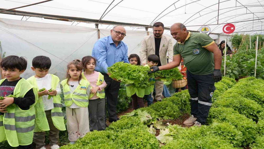 Mersin’in Erdemli ilçesinde kurulan ’çocuk serası’nda minik öğrenciler yetiştirdikleri sebzelerin hasadını yaparak hem üretmeyi öğrendi hem de doğa bilinci kazandı.
