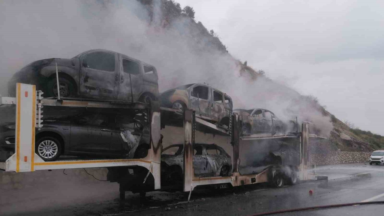 Dorsesinde 8 sıfır otomobilin bulunduğu tır yandı