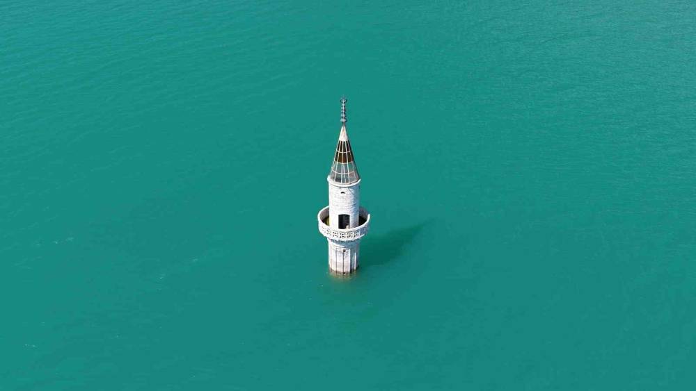 Öte yandan, baraj gölü üzerinde yalnız başına yükselen minare, su yüzeyindeki yansımasıyla dikkat çekiyor. Dron ile kaydedilen görüntüler, hem doğadaki değişimi hem de sular altında kalan bir yerleşimin izlerini gözler önüne sererken, ortaya çıkan manzara geçmiş ile bugünün aynı karede buluştuğu etkileyici bir görüntü sunuyor.