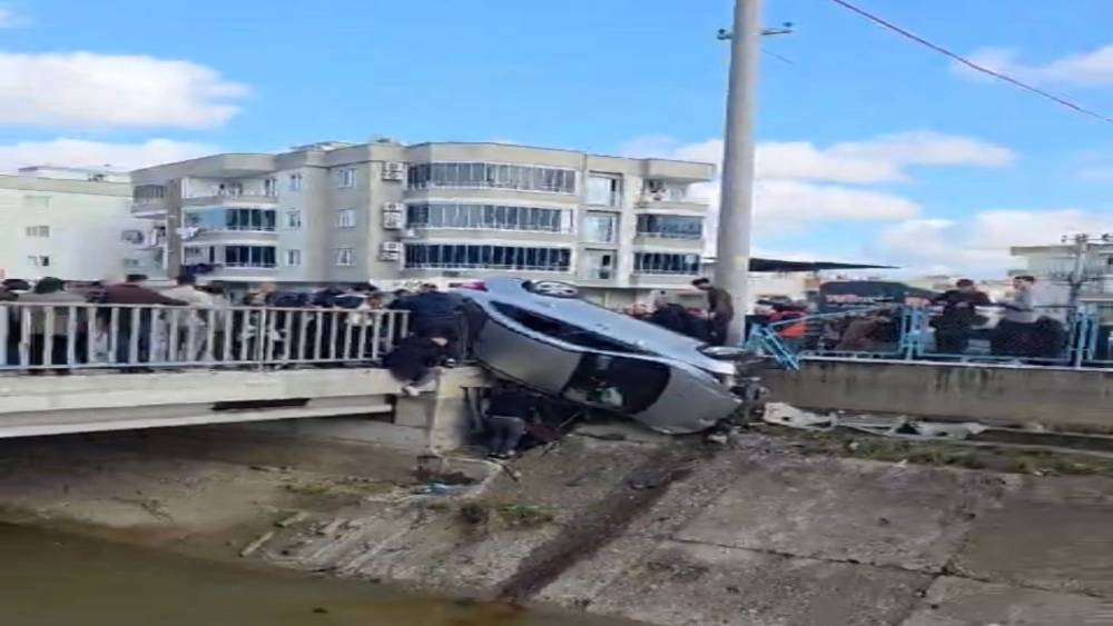 Kaza yapan araç köprünün korkuluklarında asılı kaldı, facia ucuz atlatıldı