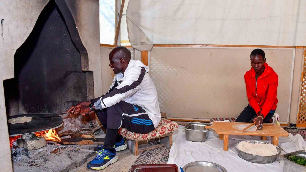 Toroslar ilçesine bağlı Darısekisi Köyü’nde hazırlıklarını sürdüren Kenyalı sporcular Mark Kosgey Kiptoo ile Truphena Chepchirchir, köylülerle kaynaşırken, ocak başına geçerek bazlama açıp, pişirerek keyifli anlar yaşadı.