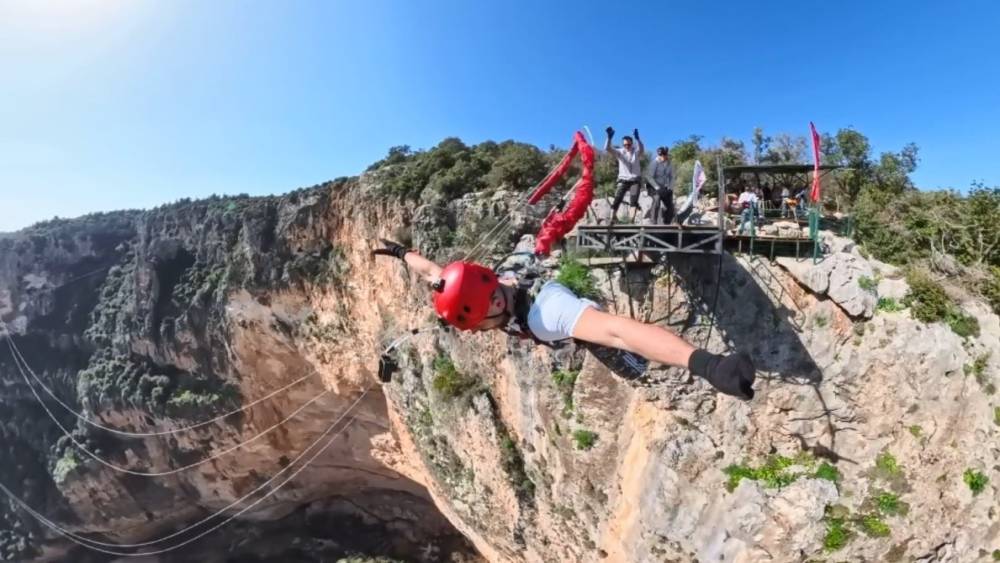Mersin’de adrenalin sevenler, 220 metre yüksekliği bulunan vadinin üzerinden halatla atlama (Rope jumping) yaparken o anlar heyecanlandırdı. 220 metre yüksekliğindeki kayalıklardan atlayanlar hayatlarının en uzun 5 saniyesini yaşayarak korku ve heyecan dolu anlar yaşadı.