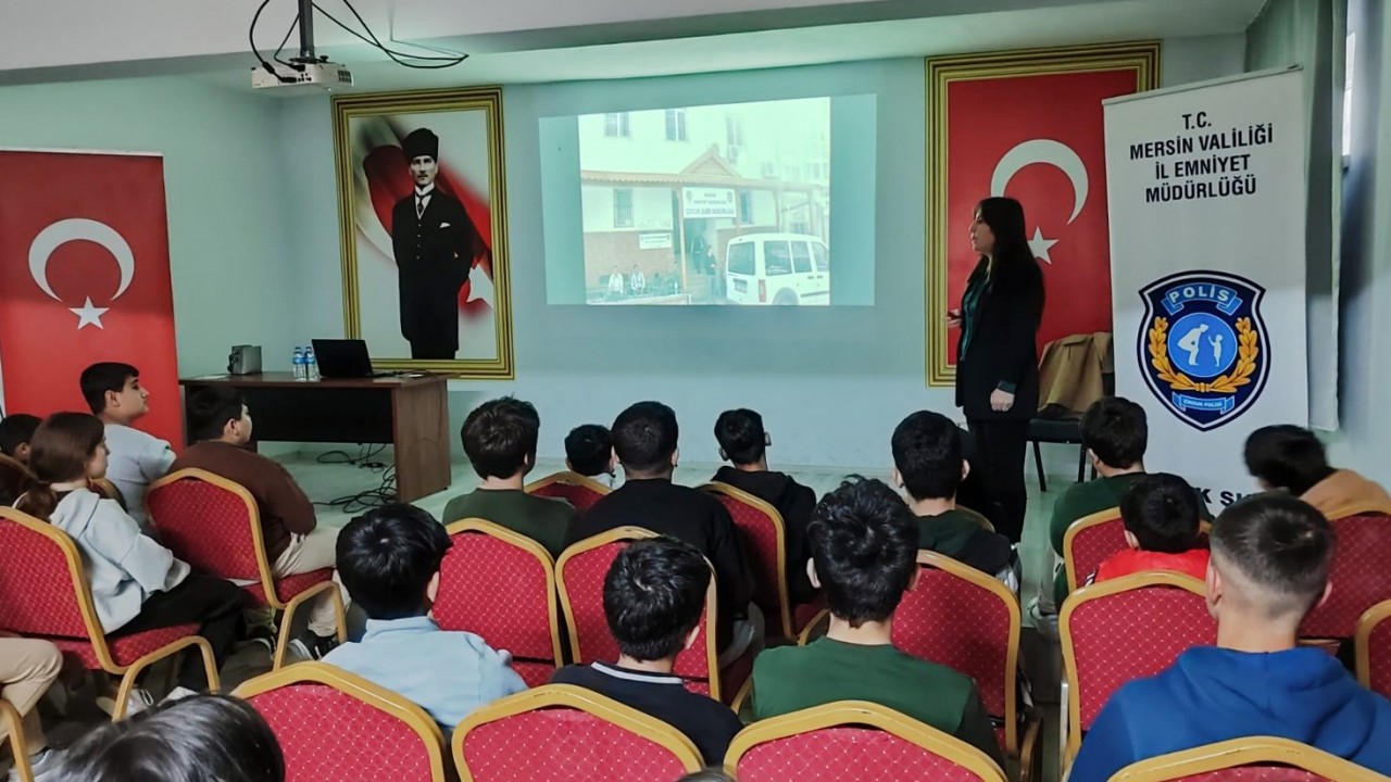 Mersin Emniyet Müdürlüğü Çocuk Şube Müdürlüğü ekipleri, çocukları bilinçlendirmek amacıyla sürdürdüğü çalışma kapsamında, Toroslar ilçesindeki çeşitli okullarda öğrencilerle bir araya geldi. Ekipler, Şehit Mustafa Sarı Ortaokulu, Mersin Mesleki ve Teknik Anadolu Lisesi, Ali Kuşçu Ortaokulu, Mustafa Kemal Ortaokulu, Hüseyin Özer Merzeci Ortaokulunda öğrencilere polisin tanımı, kişisel güvenlik ve suçtan korunma yolları, çocuk ihmali, öfke kontrolü, şiddet, internet ve sosyal medya güvenliği konularında eğitim çalışması ve bilgilendirme yaptı.