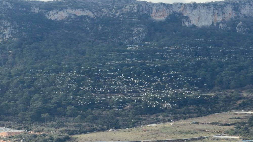 Doğal yaşamın en güzel anlarından birine sahne olan görüntülerde, ak pelikanların uzun süre birlikte hareket ederek adeta görsel şölen sunduğu görüldü.