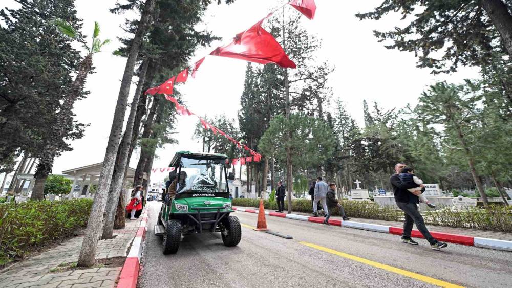 Mersin Büyükşehir Belediyesi, Ramazan Bayramı boyunca mezarlıklarda su, kolonya ve şeker ikramı ile ring hizmeti sunarak kabir ziyaretine gelen vatandaşların yanında oluyor.