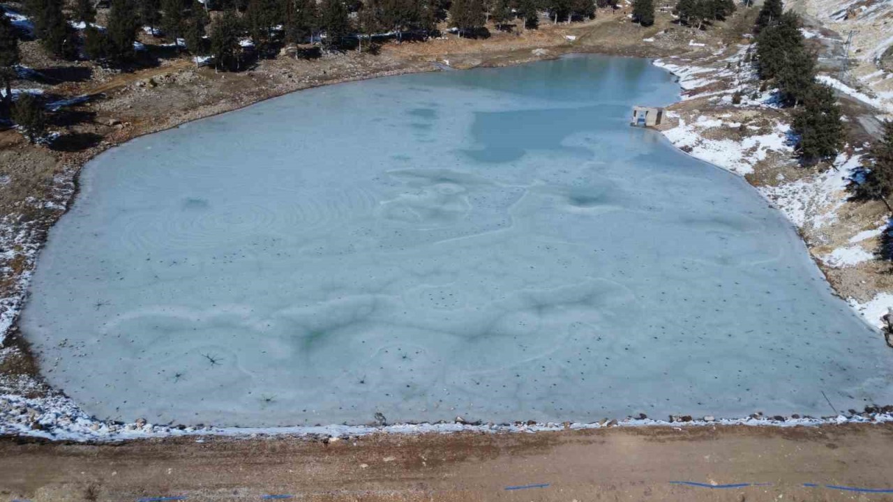 Türkiye’nin sıcak şehirlerinden Mersin’de hava sıcaklığı yüksek rakımlarda sıfırın altına kadar düşünce kuraklık nedeniyle suyu azalan Tozlu Göleti de tamamen dondu.