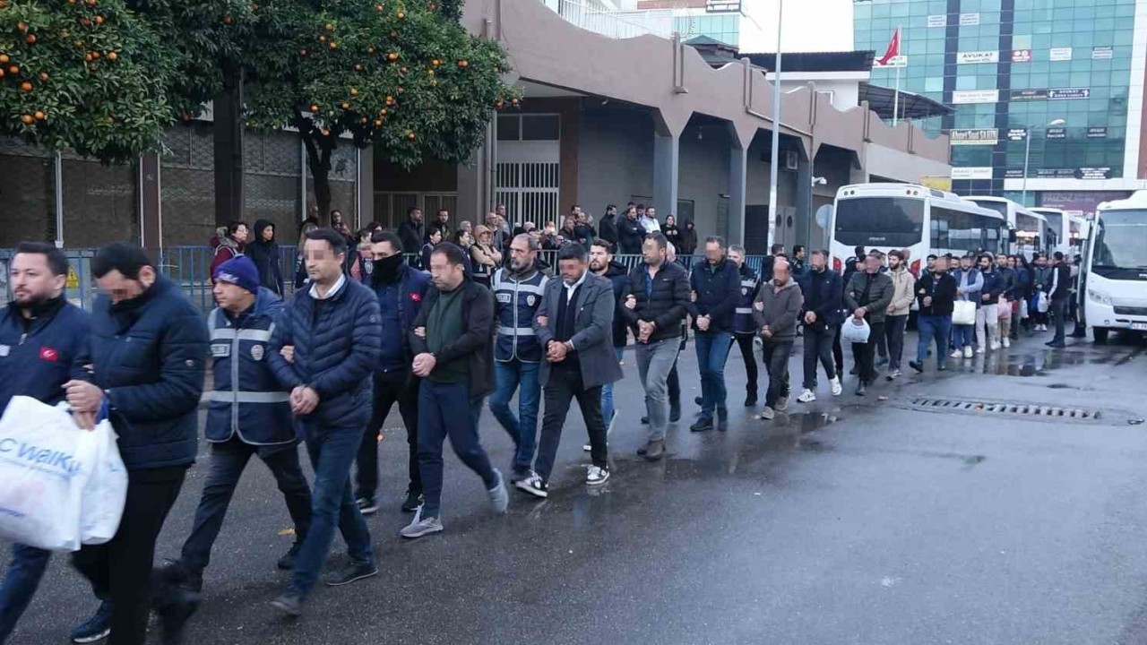 Mersin’de ’zincir’ adı verilen rüşvet operasyonunda gözaltına alınan ve aralarında kamu görevlilerinin de bulunduğu 114 şüpheli, emniyetteki işlemlerinin tamamlanmasının ardından adliyeye sevk edildi.