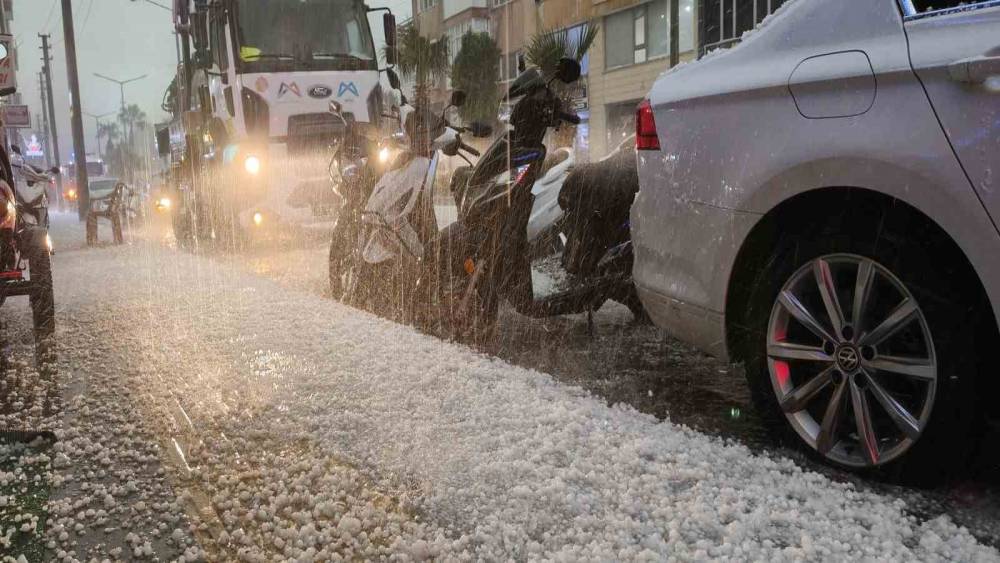 Mersin’in Silifke ilçesinde etkili olan yoğun dolu yağışı, hayatı olumsuz etkiledi. Kısa sürede etkisini artıran yağış nedeniyle sokaklar sele dönerken, kar yağışını andıran dolu çevreyi adeta beyaza bürüdü.