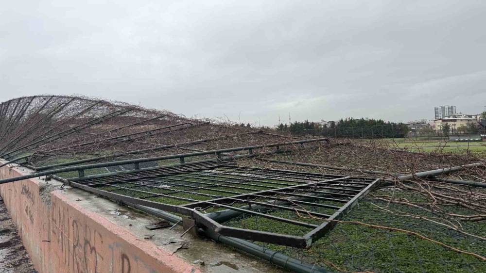 Bağlar Mahallesi’nde bulunan spor kompleksinin telle çevrili alanı şiddetli rüzgara dayanamayarak yıkıldı. Yeşil Mahalle’de iki ağaç kökünden sökülerek devrilirken, fırtınanın etkisiyle bir evin cam balkonu da patladı.