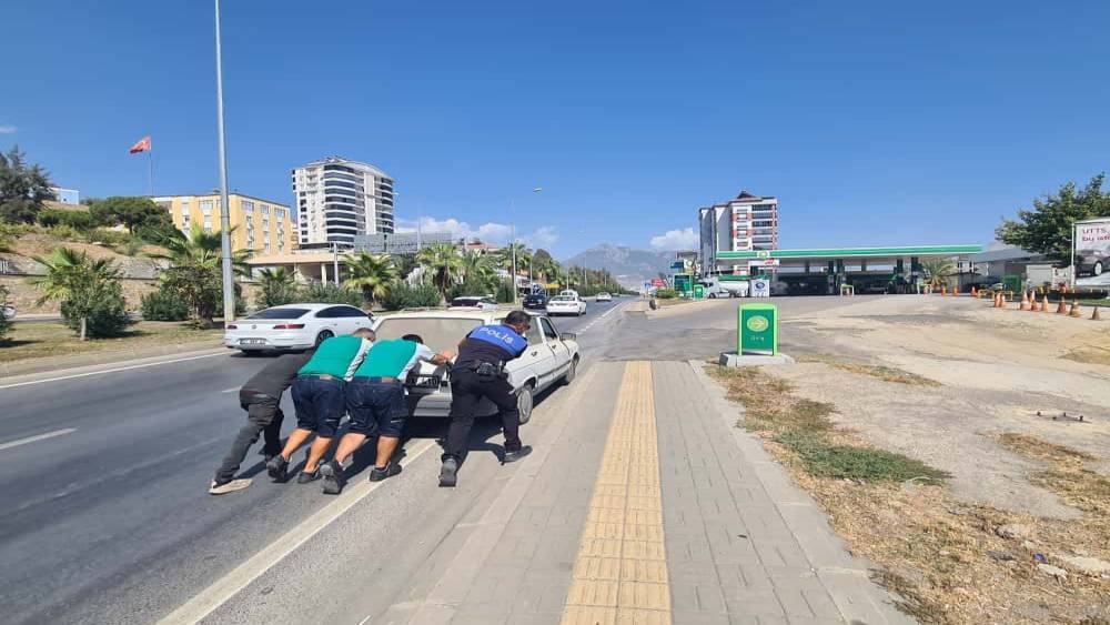 Mersin’de yakıtı biten otomobil yol ortasında kaldı. Vatandaşlar ve bir polis, aracı iterek akaryakıt istasyonuna ulaştırdı. O anlar ise bir vatandaş tarafından cep telefonuyla kaydedildi.